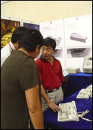 (图三)数名来宾在展位前翻阅我公司产品介绍 (图四)工作人员为来宾现场演示产品